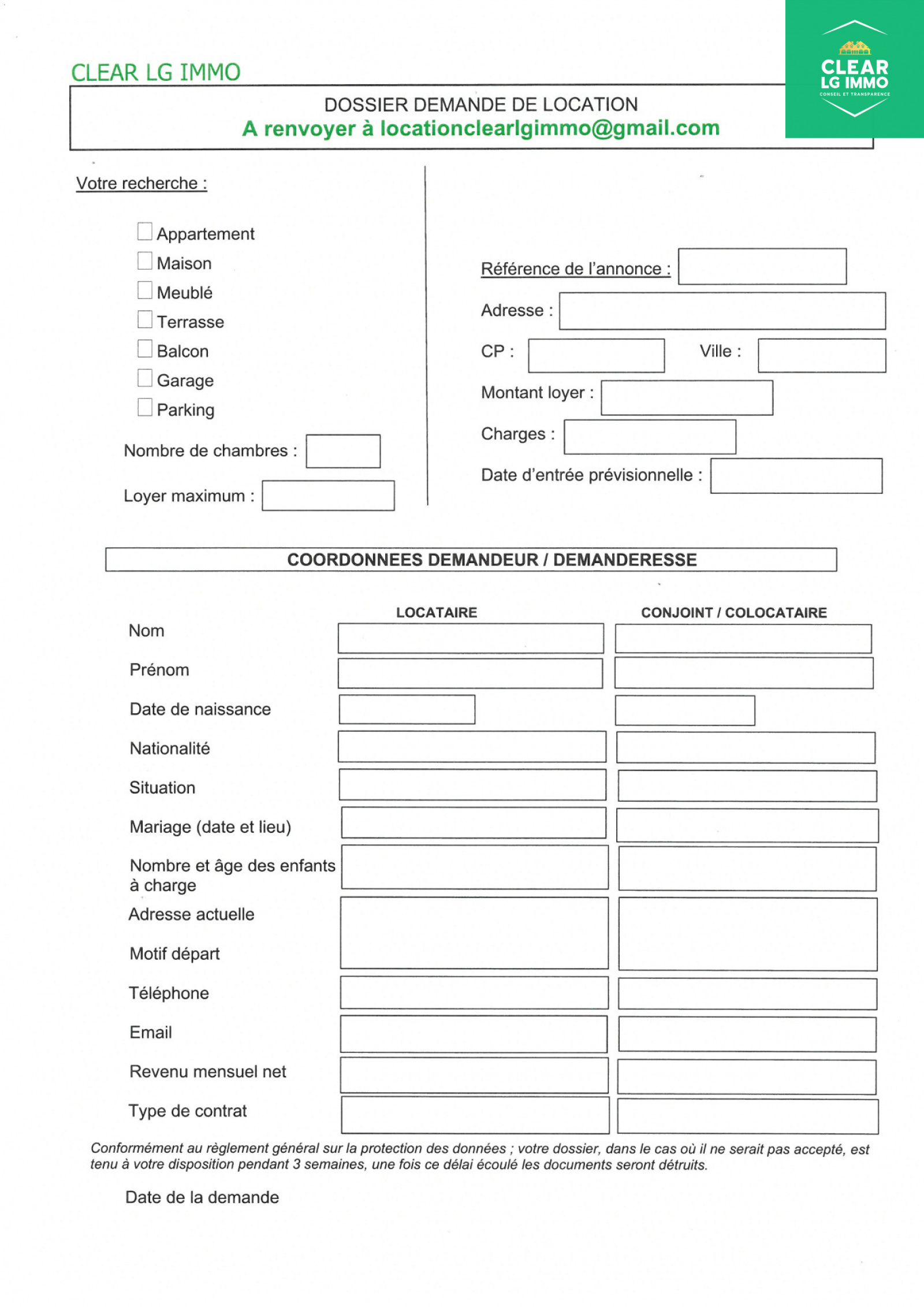 Afin de traiter votre demande de location merci de remplir et de nous renvoyer ce formulaire à l'adresse locationclearlgimmo@gmail.com.
