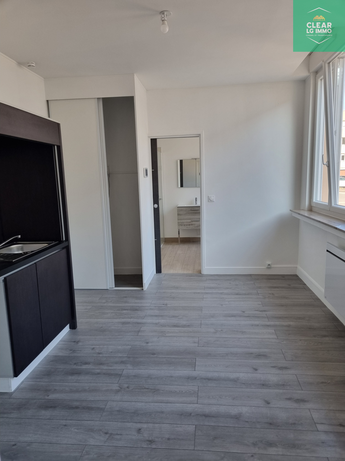 Appartement F2 situé en RDC d'un petit immeuble calme, comprenant: un séjour de 14,95 m2 avec un coin cuisine semi-équipée (plaque de cuisson induction et hotte), une chambre de 17 m2 avec un placard intégré et une salle d'eau/wc de 9 m2 (douche à l'italienne et emplacement lave-linge).