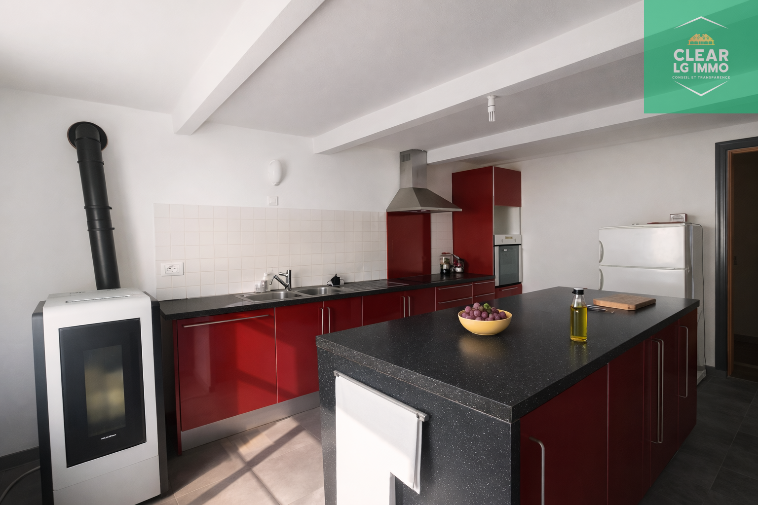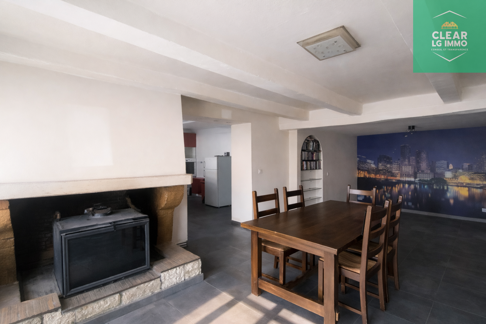 Une entrée avec WC, un espace buanderie, une cuisine équipée de 16 m² ouverte sur un agréable salon / salle à manger de 30 m² avec cheminée à bois.