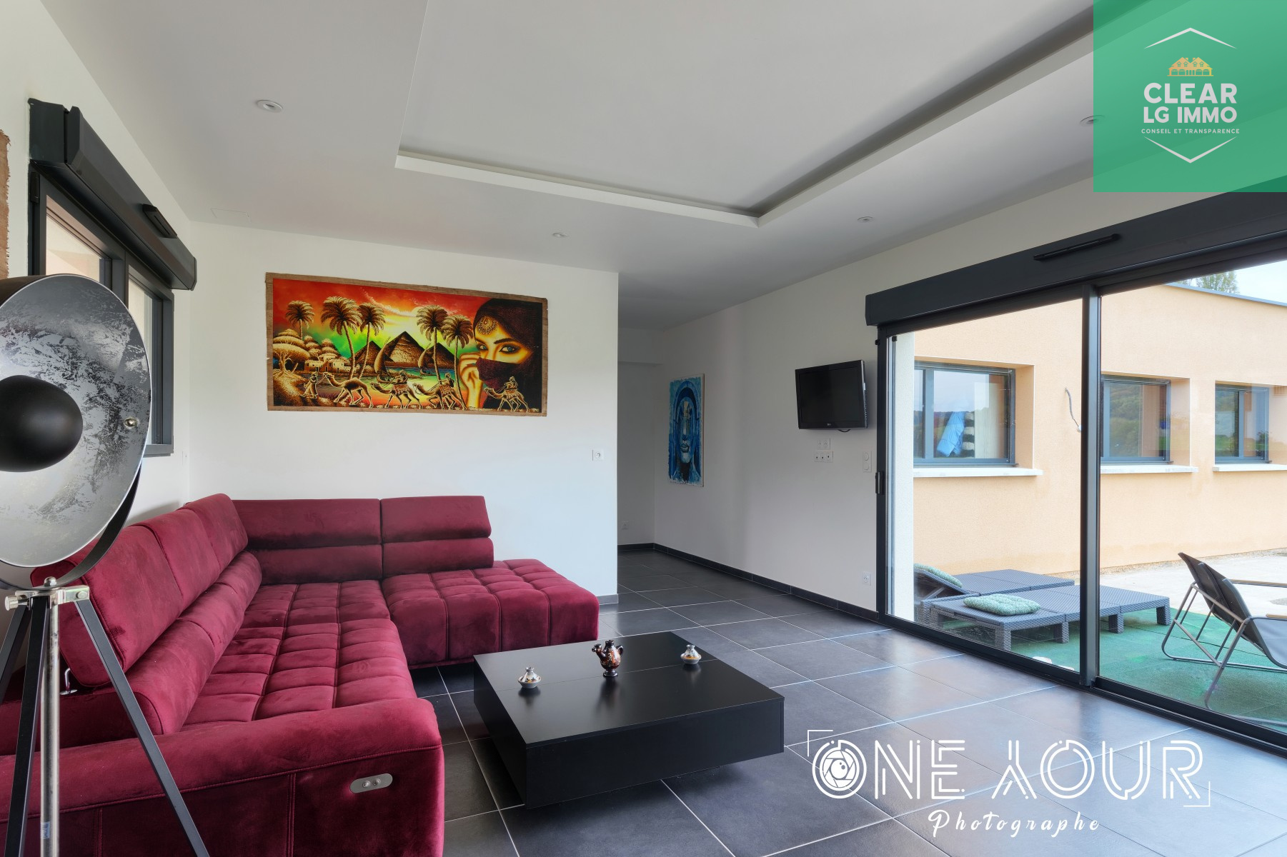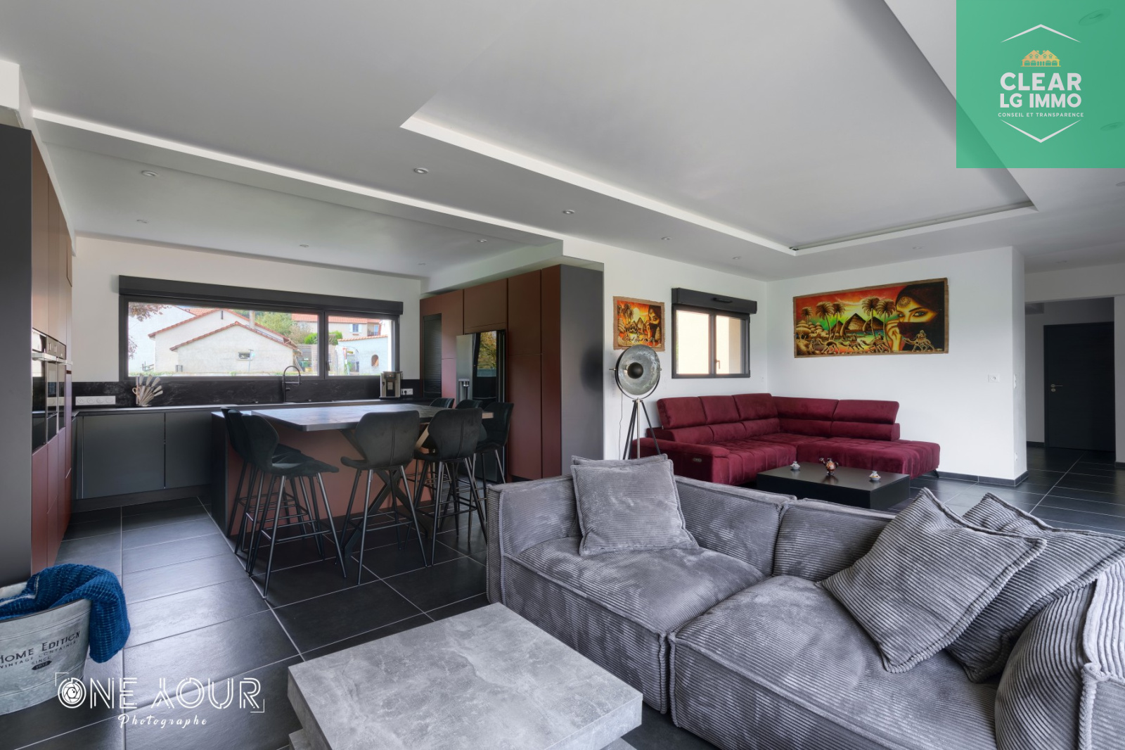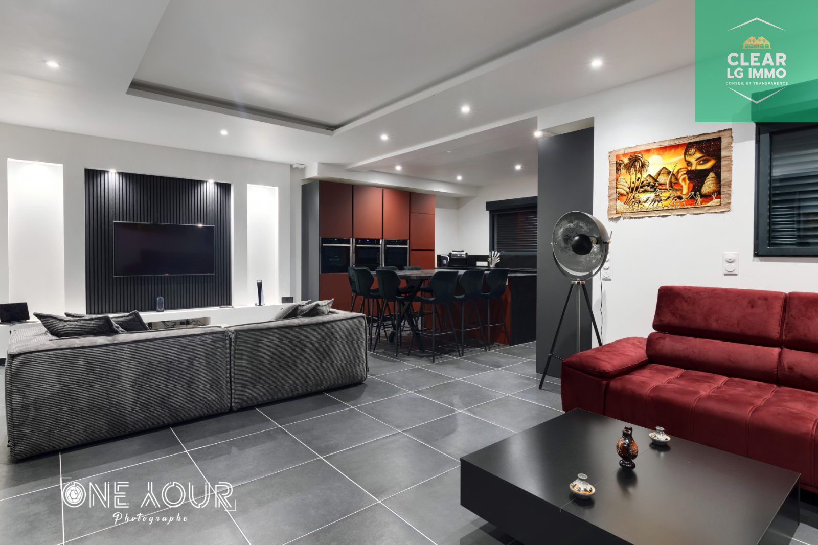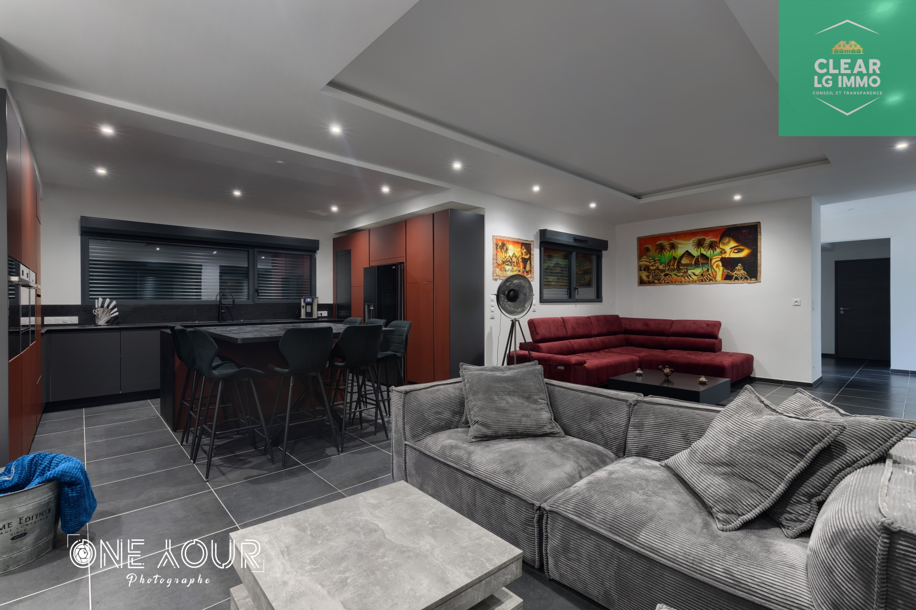 Spots LED intégrés dans la majorité des pièces pour une ambiance moderne et chaleureuse.